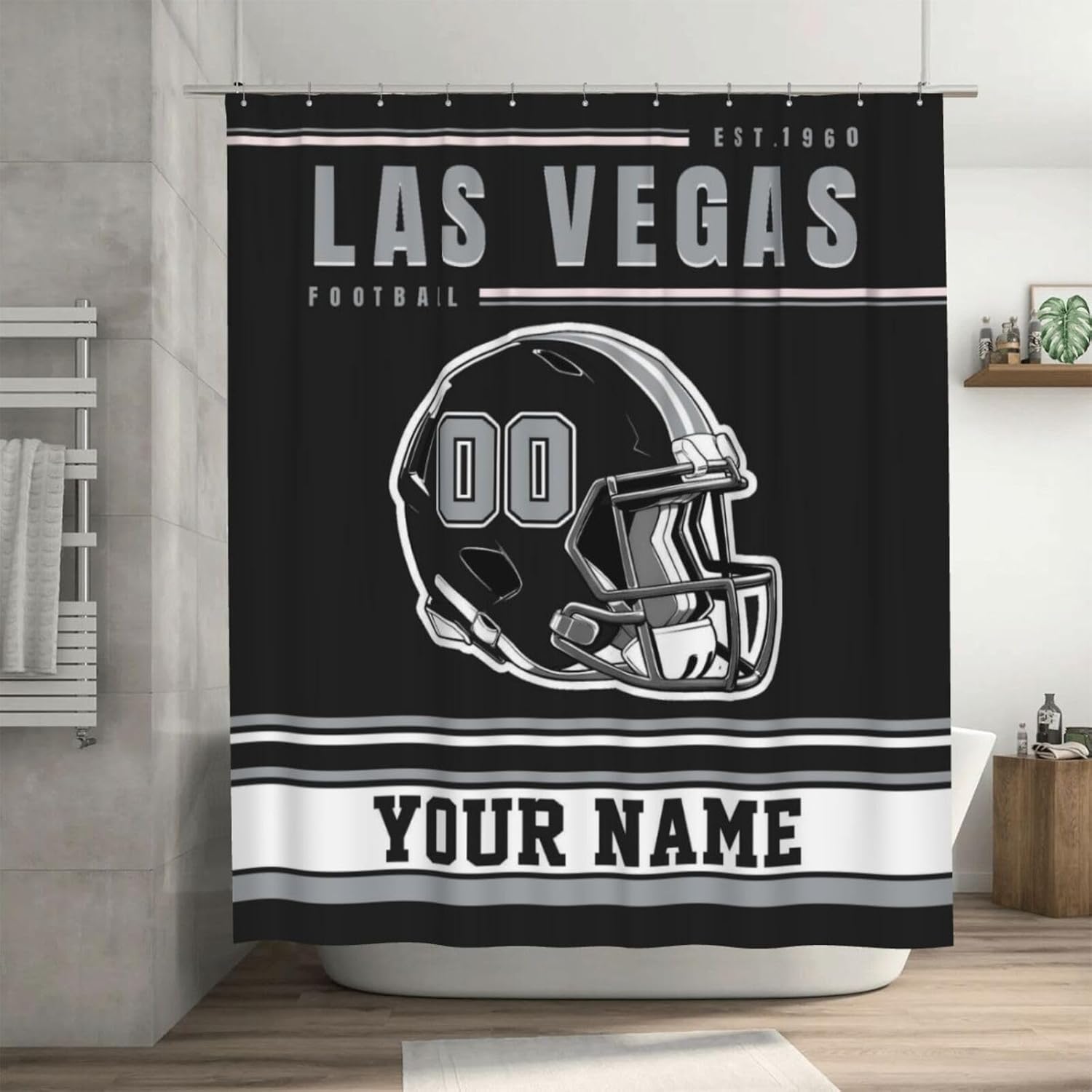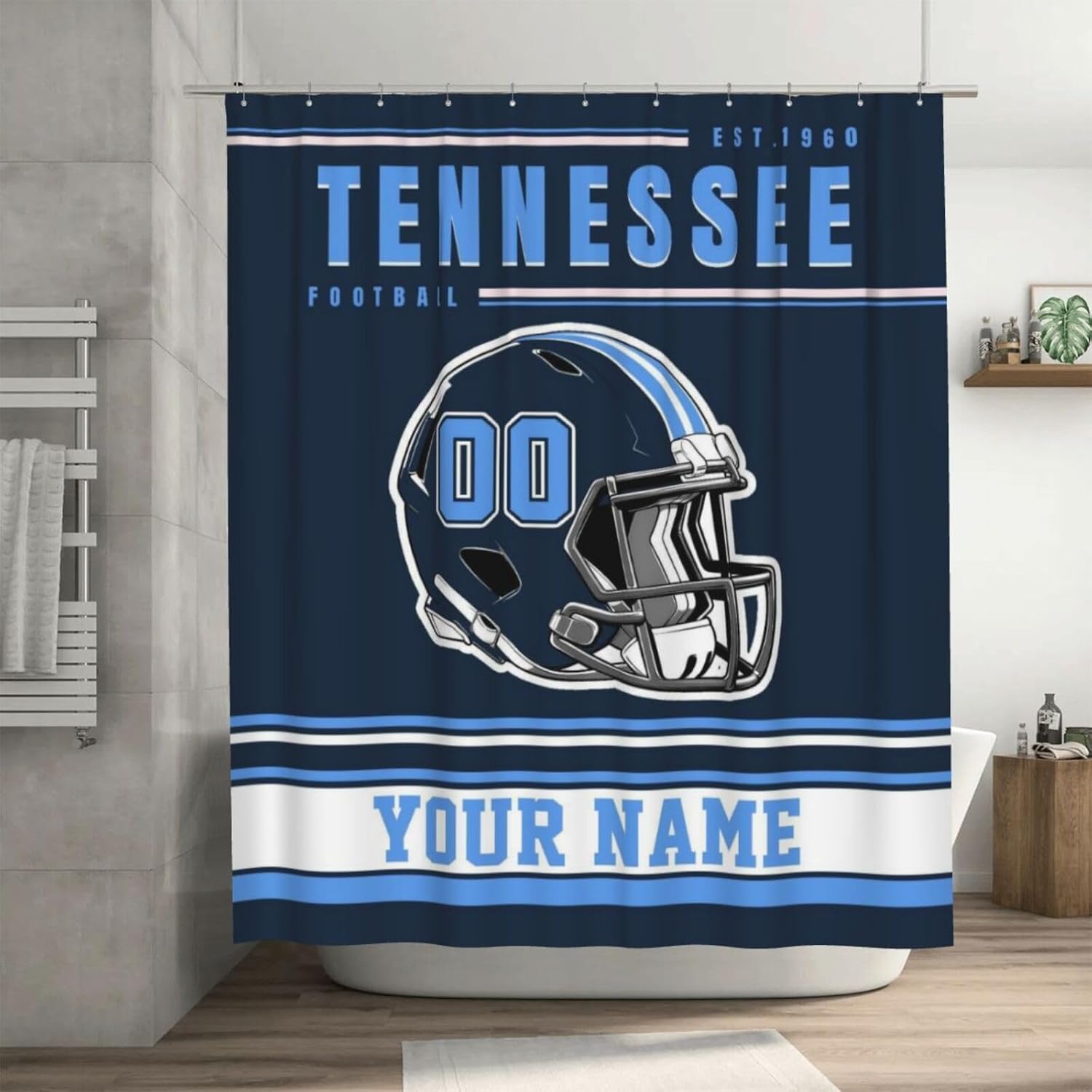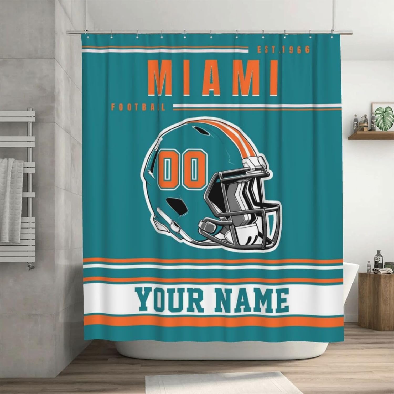 This Football style customizable shower curtain is designed for Football fans. It supports personalized names and numbers, so that you can feel the passion of the stadium every day when you shower. Create a unique player style, this shower curtain can meet your needs.Product specifications:Material: PolyesterSize: 60x72 inches, 72x72 inchesPrinting process: High-definition digital printing, long-lasting colorAccessories: Contains 12 hooks, easy to installProduct Features:1. Customizable any name and number to create a unique shower curtain, and a variety of colors are available for you to choose2. Polyester fiber waterproof material is used to effectively protect the bathroom dry.3. The design incorporates details such as Football style patterns, full of sporty feeling, a must-have for fans!4. The surface is smooth, stains can be easily wiped off, machine washing does not deform, and it remains bright and new after long-term use.5. Not only a shower curtain, but also can be used as a locker room decoration, fan surroundings, party background wall, a unique gift for Football fans!Attentive Service: We are committed to providing customers with the best service and products. If you have any questions about our products, please feel free to contact us!