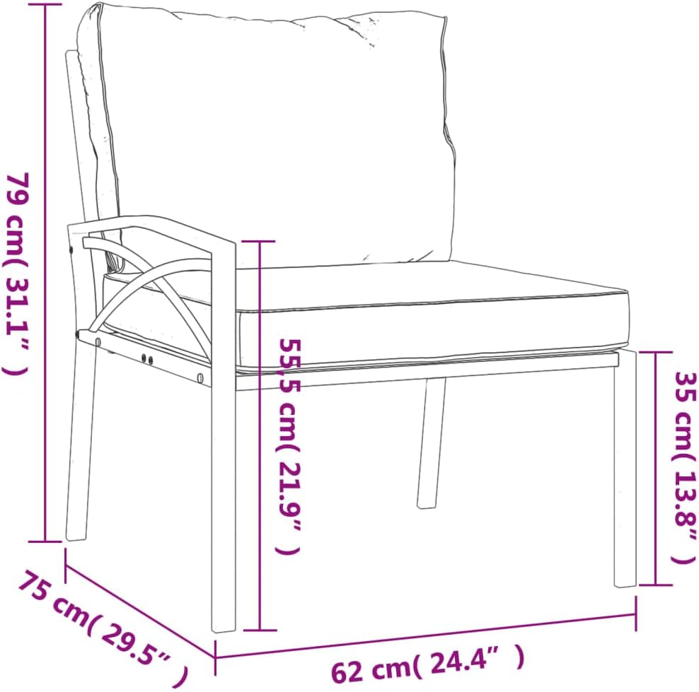 This modern garden chair is sleek and made from durable powder-coated steel, promising longevity even outdoors.for chilling out or socializing, its stylish design goes well with any balcony or garden look, while the plush grey cushions offer fabulous comfort, making it a top pick for outdoor relaxation.Durable Build: Made with powder-coated steel, this garden chair has a strong frame that can handle the elements, making it long-lasting. The coating means it won't rust or corrode, which is key for outdoor furniture.Comfy Seating: Each chair has plush cushions made from weather- polyester fabric, giving a cozy spot for lounging. The cushions have a zipper for easy removal and cleaning, keeping your seating fresh.Elegant Style: The modern look is enhanced by the curved armrests, making it not just comfortable but stylish too. This chic addition enhances your outdoor vibe.Versatility: These garden chairs fit various spaces—perfect for balconies, patios, or anywhere outdoors, offering great comfort for gatherings or peaceful solo time. Their sleek design and color scheme make them a stylish choice for any garden furniture mix.Space Efficient: With measurements of 29.5 in wide, 24.4 in long, and 31.1 in high, these chairs work well in smaller areas while still allowing comfy lounging.Number Of Items: 2Color: Black Shape: SquareMaterial: Metal Powder-Coated SteelFinish: Powder-Coated Indoor/Outdoor: Indoor / OutdoorCover Included: NoRoom: Garden and terraceCapacity: 242.5 lbsMaximum Number of People: 1Maximum Weit: 242.5 lbsDimensions: 29.5 x 24.4 x 31.1 in (W x L x H)Leg Height: 13.8 inWeight: 36.6 lbsSeat Depth: 23.6 inSeating Capacity: 1Swings: No